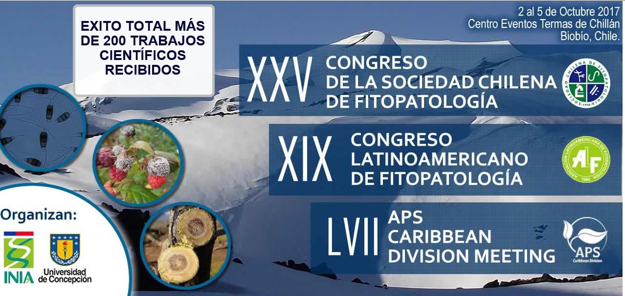 El Instituto de Investigaciones Agropecuarias INIA y las Facultades de Agronomía y Ciencias Forestales de la Universidad de Concepción, han organizado el XXV Congreso de la Sociedad Chilena de Fitopatología y XIX Congreso Latinoamericano de Fitopatología a realizarse los días 02-05 de octubre de 2017, en el Centro de Eventos Termas de Chillán, Región del Biobío, Chile.