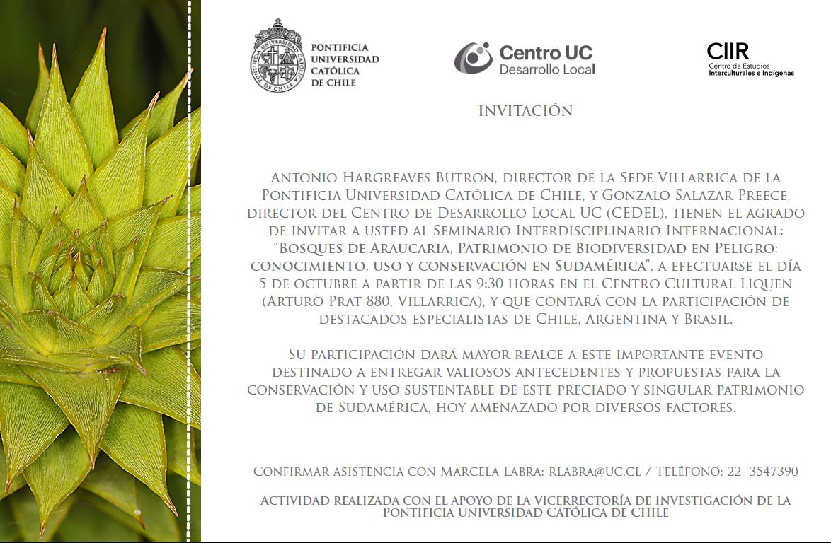 La Pontificia Universidad Católica de Chile, a través del Centro de Desarrollo Local UC (CEDEL) de Villarrica, ha organizado el seminario interdisciplinario internacional ?Bosques de Araucaria, patrimonio de biodiversidad en peligro: conocimiento, uso y conservación en Sudamérica?, el que se realizará el día 5 de octubre a partir de las 9:30 horas en el Centro Cultural Liquen (Arturo Prat 880, Villarrica), y que contará con la participación de destacados especialistas de Chile, Argentina y Brasil. Para mayor antecedentes en http://ciir.cl/