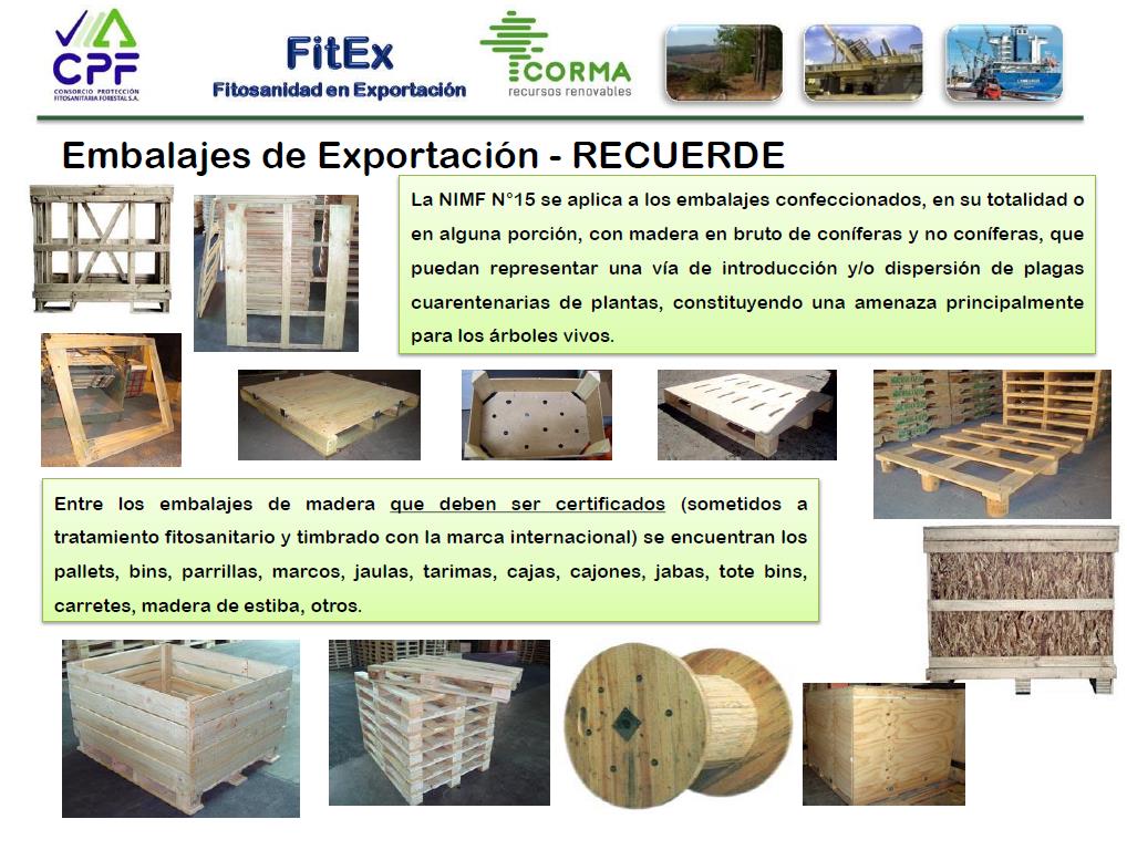 Entre los embalajes de madera que deben ser certificados (sometidos a tratamiento fitosanitario y timbrado con la marca internacional) se encuentran los pallets, bins, parrillas, marcos, jaulas, tarimas, cajas, cajones, jabas, tote bins, carretes, madera de estiba y otros.