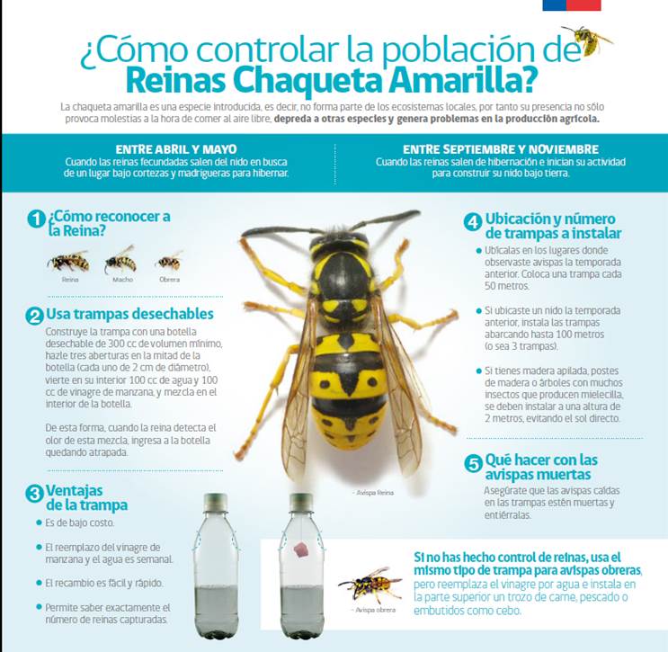 La campaña ?¡Avíspate, atrapa a la reina chaqueta amarilla!? busca disminuir la población de Vespula germánica, a través de una trampa muy simple de elaborar y que es muy eficiente en apoyar el control de esta especie dañina que perjudica a las personas, pero también a la población de abejas polinizadoras y otros rubros del sector silvoagropecuario.