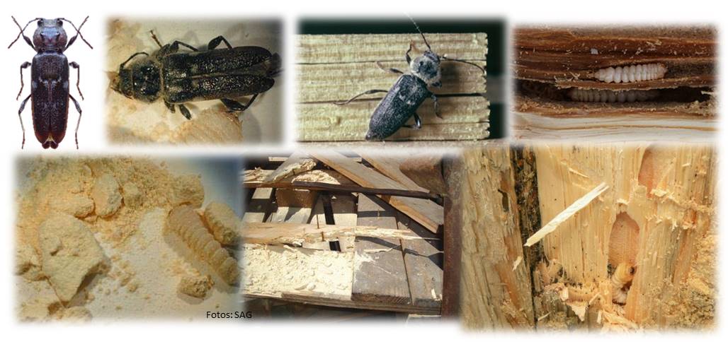 Hylotrupes bajulus (Coleoptera: Cerambycidae), un barrenador de madera seca que se alimenta de coníferas especialmente de madera en servicio es posible, en los momentos de silencio, escuchar a las larvas royendo la madera al hacer sus galerías.