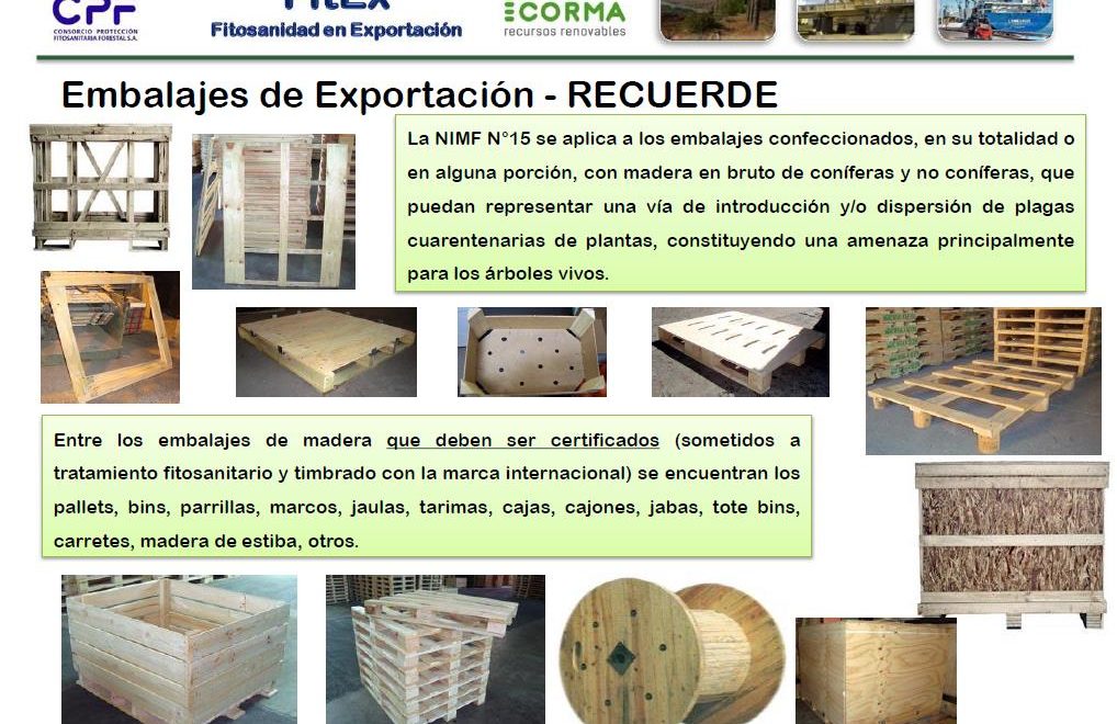Entre los embalajes de madera que deben ser certificados (sometidos a tratamiento fitosanitario y timbrado con la marca internacional) se encuentran los pallets, bins, parrillas, marcos, jaulas, tarimas, cajas, cajones, jabas, tote bins, carretes, madera de estiba y otros.